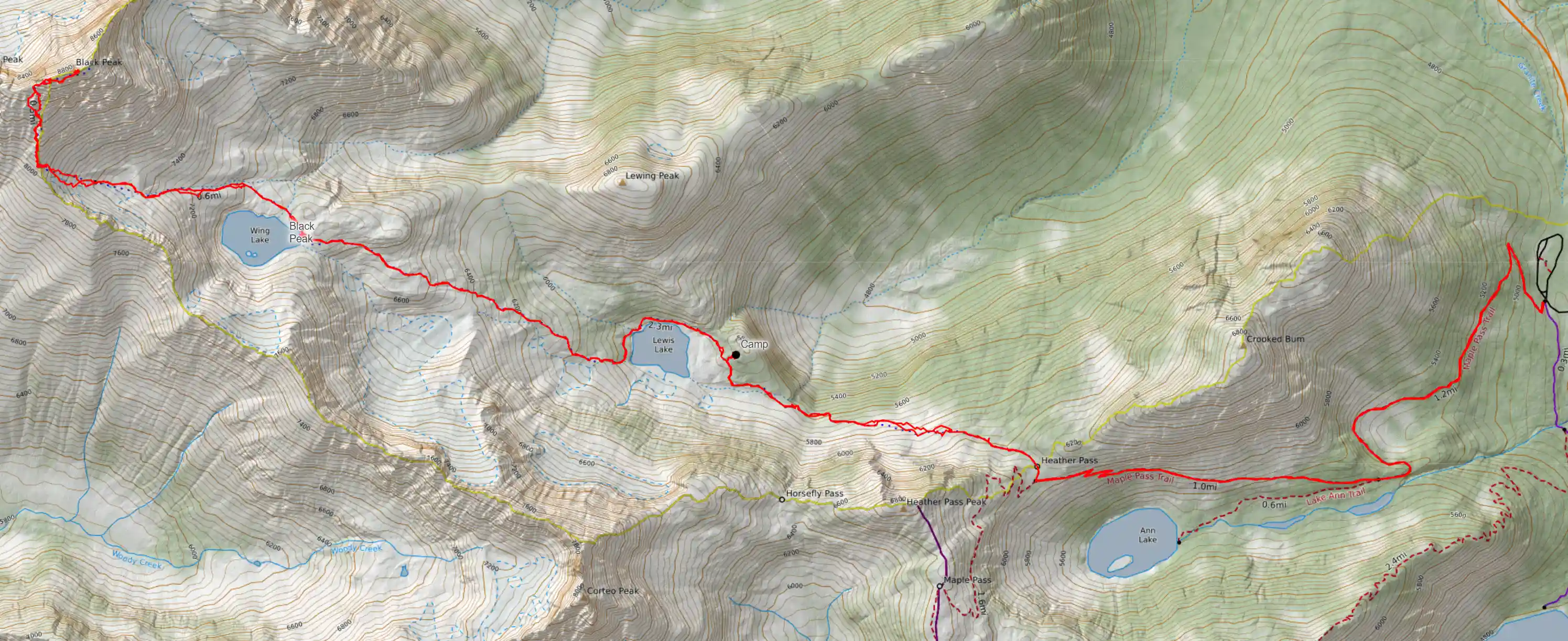 After the col, the terrain became looser, but it wasn’t too troublesome. We stayed mostly on the west side of the ridge, and the route remained obvious. After reaching base of false summit, the standard route traverses to the right, leading to a small saddle, where Black Peak looms to the left. The crux of the climb is a short, 20-foot, exposed Class 3-4 scramble. While I’m not the most experienced scrambler, this was the most exposed section I’ve ever done. Going up was fine, but we definitely felt a bit nervous on the way down. From Lewis Lake to the summit of Black Peak, it took us about 4 hours, including a 30-minute break for breakfast at Wing Lake.