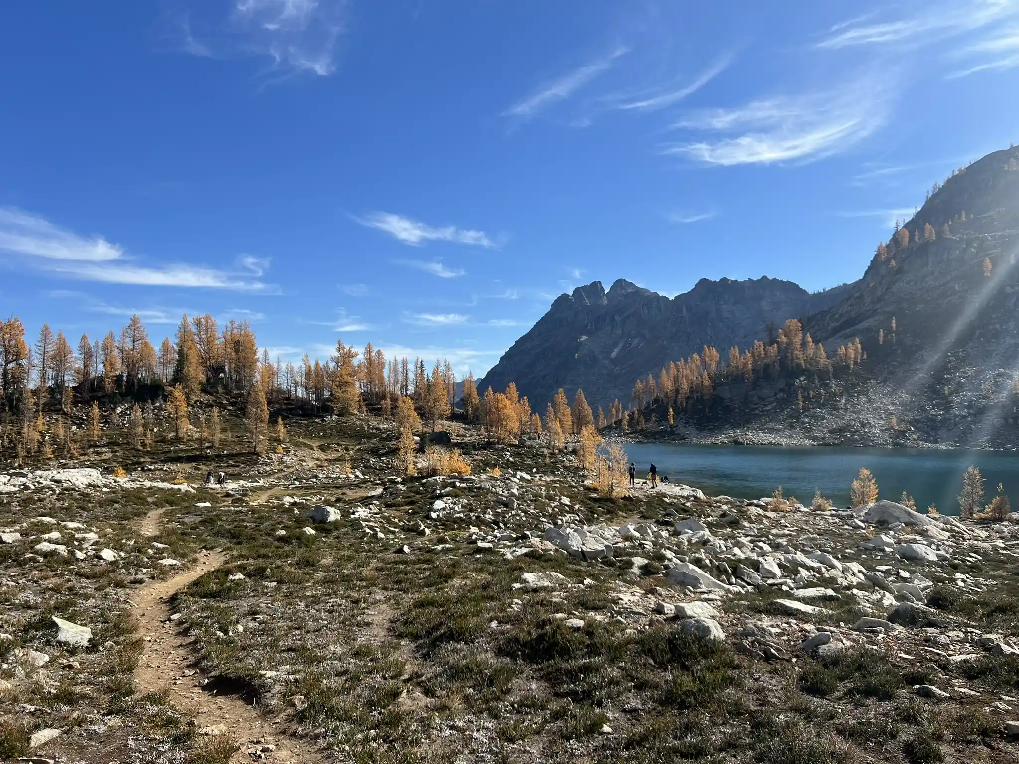 The next day, we set off at 7 a.m. and finally got to see just how stunning the area was during larch season. The larches were at their peak, and they were everywhere! About an hour and a half later, we arrived at Wing Lake, once again amazed—this time by the sheer number of tents. Chutang estimated there were roughly 60–80 tents around the lake, dubbing it the “Black Peak Base Camp” (BBC), though most of the campers were just backpackers.