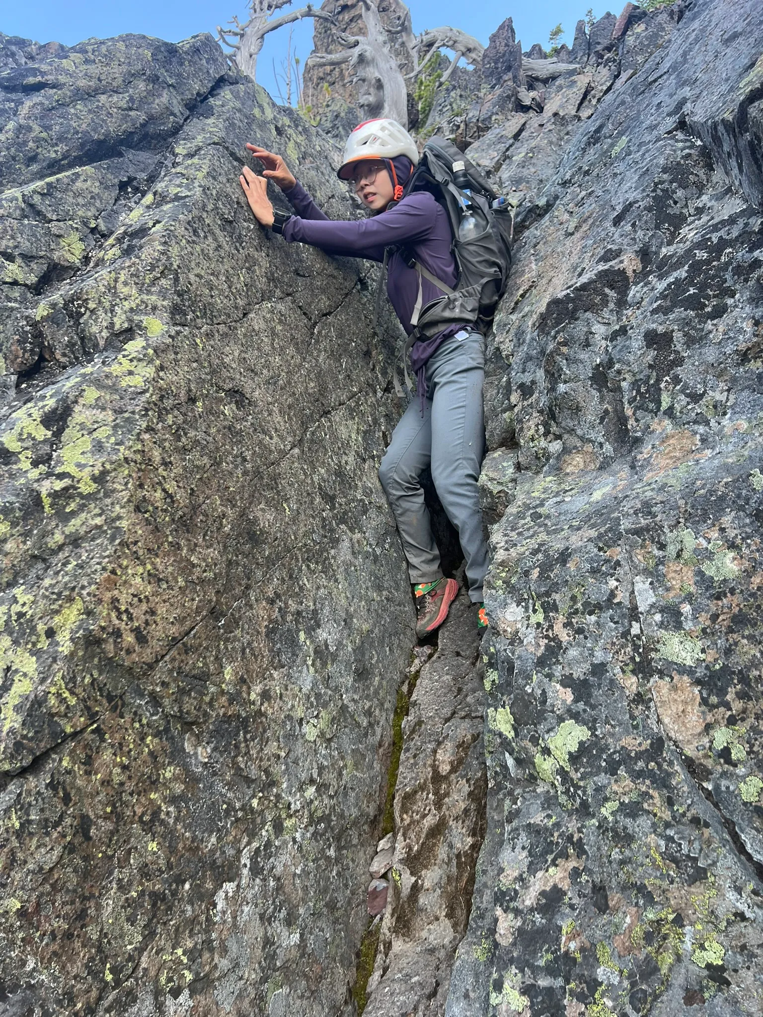 The chokestone chimney is a solid class 4, but it is short. The start has no good handholds and no good footholds until you commit to a big move. Rock shoes would help, though Chutang and I managed in trail runners and downclimbed it. If you have an inexperienced climber, I strongly recommend using a handline or rappel here. There’s a webbing and rappel ring on a tree directly above the chimney.