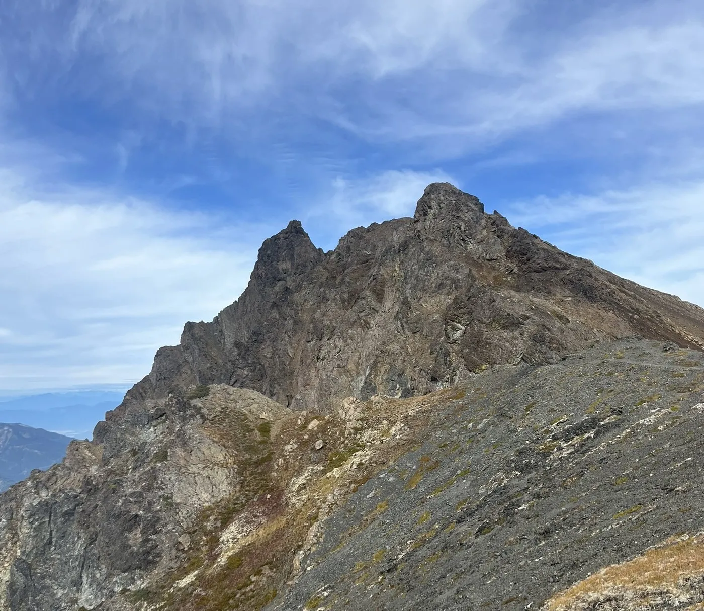 When gaining the last false summit, it is tempting to stay high on the ridge, but there is a large gap between the first and second gendarmes that makes crossing impossible. Both AllTrails and Gaia incorrectly show the route staying on the ridge. Instead, traverse snow or scree to find the class 3 gully that bypasses a few gendarmes and leads you back to the ridge. If you encounter anything harder than class 3, step back and look for another gully. We used the gully at (48.97392, -121.70649). On 09/29/2025 we stayed entirely on rock, but earlier in the season you may need an ice axe.